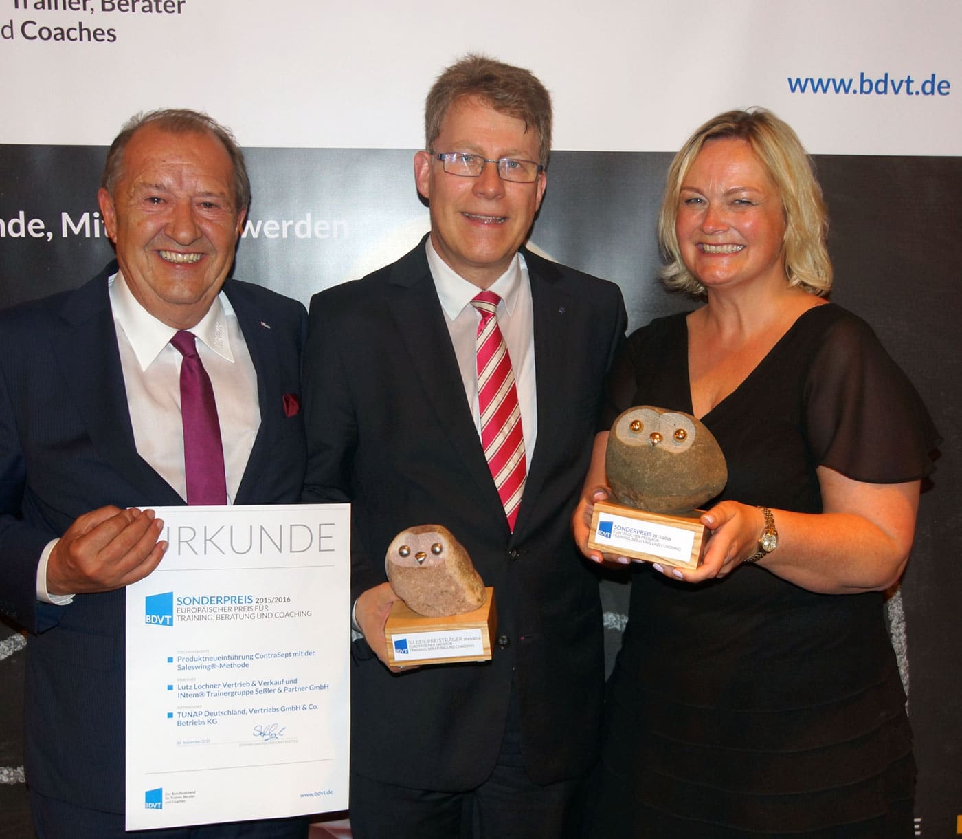 Die unendliche Trainingspreis-Geschichte des INtem®-Instituts geht in die nächste Runde. Bei der Verleihung des Europäischen Preises des BDVT (Berufsverband Deutscher Trainer, Berater und Coaches) erhielt der INtem®-Kooperationspartner Lutz Lochner gleich zwei Auszeichnungen – den Trainingspreis in Silber und den Sonderpreis für Trends und Zukunft.